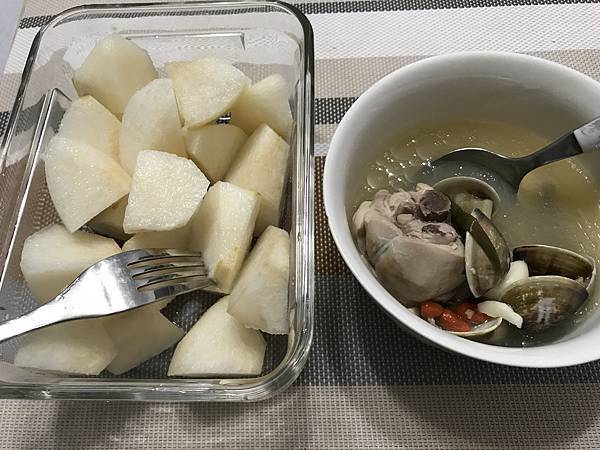 晚餐:自製 蒜頭蛤蜊雞湯 + 半顆水梨