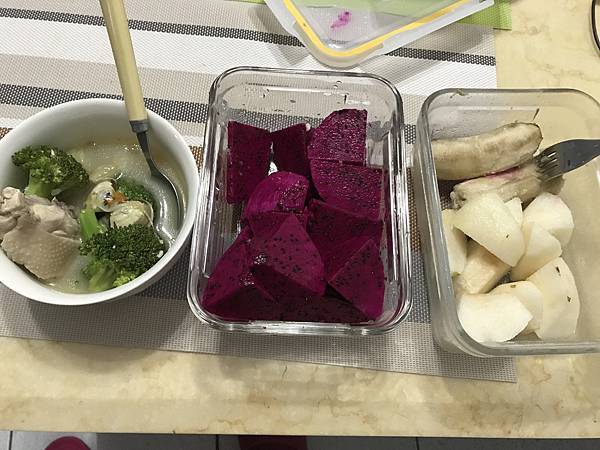 中餐:自製蒜頭雞湯 + 香蕉一根 + 水梨2/3顆 + 紅龍果1顆