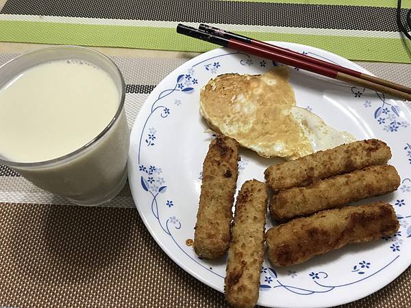 晚餐:微甜豆漿 300ml + 荷包蛋 + 鱈魚條5條