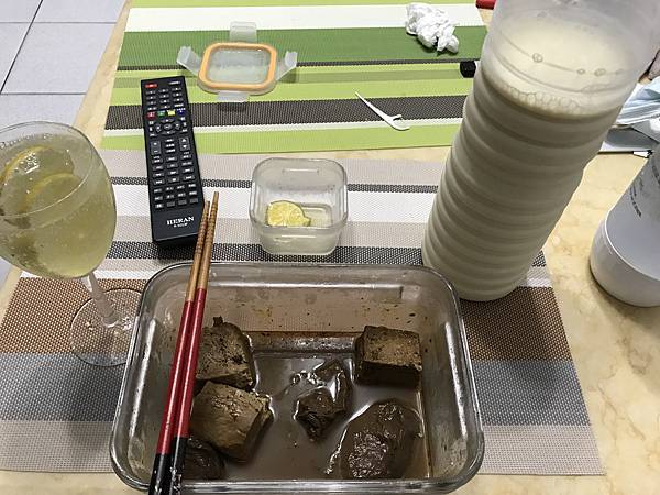 晚餐:豆漿300ml+民雄紅吱吱麻辣鴨血豆腐+水梨一顆
