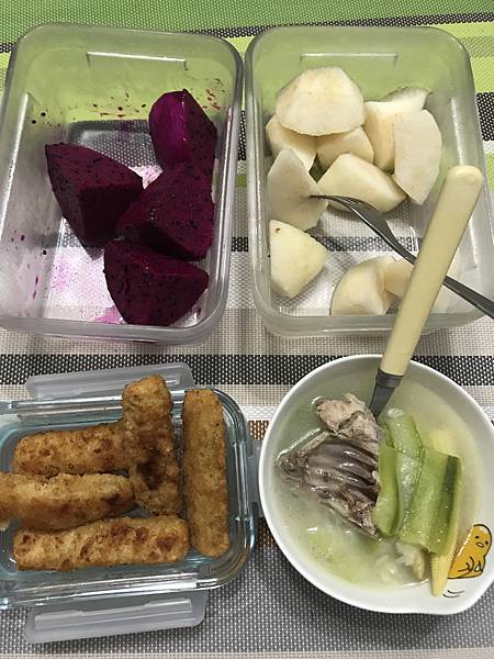 晚餐:絲瓜雞湯+鱈魚條五條+水梨半顆+紅龍果半顆