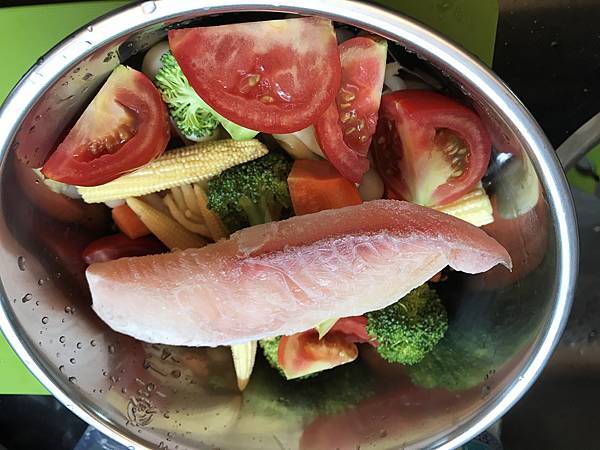 晚餐:五穀紫米鯛魚番茄花椰菜玉米筍菇菇炊飯大雜燴+